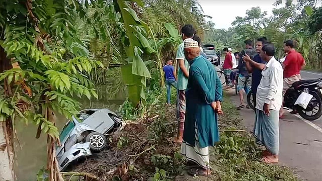 পিরোজপুরে চালক নিয়ন্ত্রণ হারালে প্রাইভেটকারটি খালে পড়ে আট যাত্রীর সবাই নিহত হয়ন। ছবি: সংগৃহীত