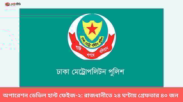 রাজধানীতে অপারেশন ডেভিল হান্ট ফেইজ-২ এর আওতায় গত ২৪ ঘণ্টায় অভিযান পরিচালনা করে বিভিন্ন অপরাধে জড়িত মোট ৪০ (চল্লিশ) জনকে গ্রেফতার করেছে ঢাকা মেট্রোপলিটন পুলিশের মুগদা, মিরপুর, রুপনগর ও শেরেবাংলা থানা পুলিশ। এর মধ্যে মুগদা থানা ২৫ জন, মিরপুর মডেল থানা তিনজন, রূপনগর থানা নয়জন ও শেরেবাংলা থানা তিনজনকে গ্রেফতার করেছে।