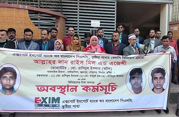 ঋণ গ্রহীতা দুই ব্যবসায়ীর বাড়ি ও ব্যবসা প্রতিষ্ঠানের সামনে অবস্থান নেন এক্সিম ব্যাংকের কর্মকর্তা-কর্মচারারী। তাদের হাতে ছিল ঋণ গ্রহীতার ছবিযুক্ত ব্যানার।