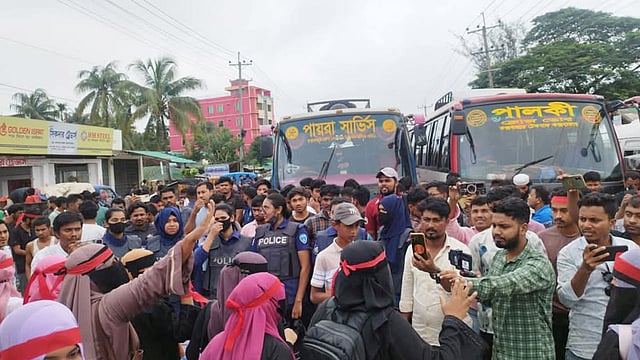 রোহিঙ্গা ক্যাম্পে এনজিও পরিচালিত স্কুল থেকে স্থানীয় শিক্ষকদের চাকরিচ্যুত করার প্রতিবাদে কক্সবাজার-টেকনাফ মহাসড়ক অবরোধ করেছেন আন্দোলনরত শিক্ষকরা। এতে ওই মহাসড়কে শত শত যানবাহন আটকে পড়ে। দুর্ভোগে পড়েন যাত্রী ও পথচারীরা।