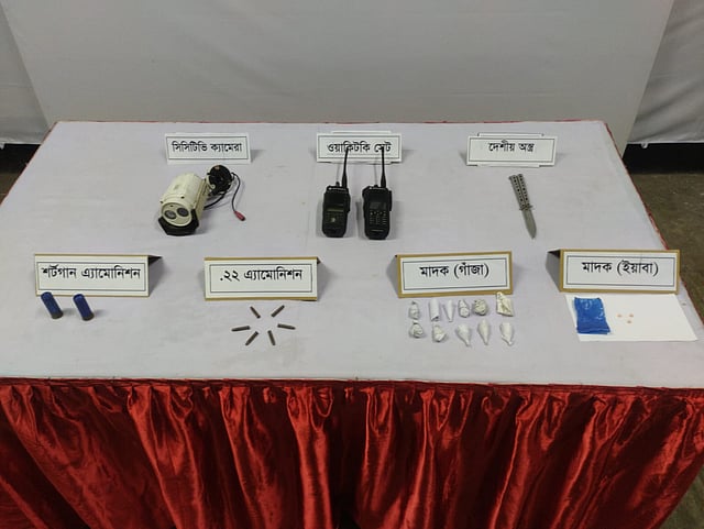 রোববার (৬ অক্টোবর ২০২৪ খ্রি.) দিবাগত রাত দেড়টায় সেনাবাহিনীর সহযোগিতায় শাহ আলী মাজার শরীফ আড়ৎ কমপ্লেক্স এর শেড নং -১১, আড়ৎ নং ৯৭-৯৮ এর সামনে পাকা রাস্তার উপর একটি প্লাস্টিকের বাজারের ব্যাগের মধ্যে থেকে .২২ এমোনিশনের ৬ রাউন্ড গুলি, শটগানের ২ রাউন্ড কার্তুজ, ২টি Motorola ওয়্যারলেস সেট, ১টি Hikvision সিসি ক্যামেরা, ১টি ল্যাপটপ চার্জার, ১টি ছুরি, ১১ পুরিয়া গাঁজা ও ৩ পিস ইয়াবা পরিত্যক্ত অবস্থায় উদ্ধার করা হয়।