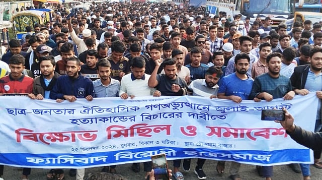 বুধবার কুমিল্লার চৌদ্দগ্রামে ‘ফ্যাসিবাদবিরোধী ছাত্রসমাজ’-এর ব্যানারে এক বিক্ষোভ মিছিল ও সমাবেশে কানুকে গ্রেপ্তারের দাবি জানানো হয়। ছবি-সংগৃহিত।