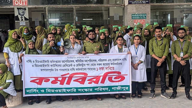 গাজীপুরে নার্সিং কর্মকর্তা ও নার্সিং শিক্ষার্থীরা কর্মবিরতি করছে।