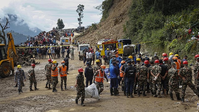 ধাদিংয়ের ত্রিভুবন মহাসড়কের ঢ্যাপলেখোলায় ভূমিধসে মৃত ব্যক্তিদের মরদেহ উদ্ধার করছে নেপালের পুলিশ।ছবি: সংগৃহীত