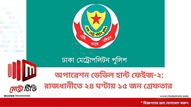 রাজধানীতে অপারেশন ডেভিল হান্ট ফেইজ-২ এর আওতায় গত ২৪ ঘণ্টায় অভিযান পরিচালনা করে ১৫ জনকে গ্রেফতার করেছে ঢাকা মেট্রোপলিটন পুলিশের পল্লবী, খিলগাঁও, বাড্ডা, তুরাগ, যাত্রাবাড়ী, উত্তরা পশ্চিম ও হাতিরঝিল থানা পুলিশ। এর মধ্যে পল্লবী থানা একজন, খিলগাঁও থানা দুইজন, বাড্ডা থানা দুইজন, তুরাগ থানা একজন, যাত্রাবাড়ী থানা পাঁচজন, উত্তরা পশ্চিম থানা তিনজন ও হাতিরঝিল থানা একজনকে গ্রেফতার করেছে।