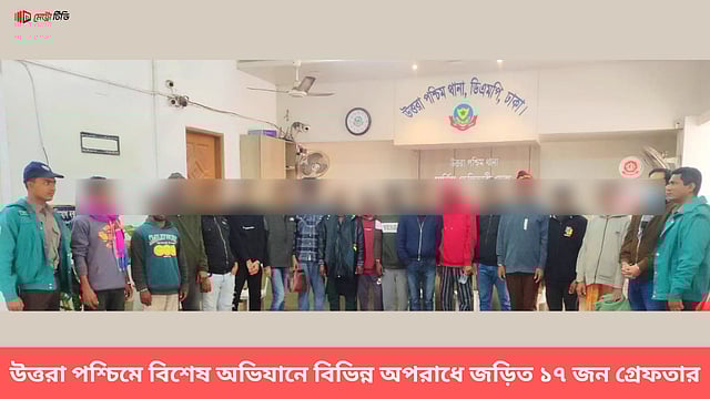 রাজধানীর উত্তরা পশ্চিম থানা এলাকায় দিনব্যাপী বিশেষ অভিযান চালিয়ে বিভিন্ন অপরাধে জড়িত মোট ১৭ জনকে গ্রেফতার করেছে ঢাকা মেট্রোপলিটন পুলিশের উত্তরা পশ্চিম থানা পুলিশ।
