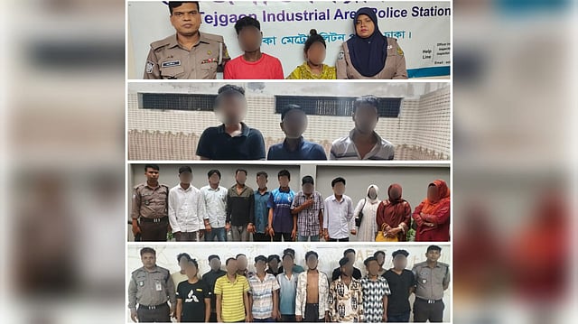 গ্রেফতারকৃতরা হলো-১। মোঃ সামির খান (২০) ২। ফারুখ আহম্মেদ (৪৬) ৩। মোঃ আনোয়ার হোসেন (৩৫) ৪। মোঃ দিপু (২৩) ৫। মোঃ রাফি (২০) ৬। মোঃ নাজমুল ইসলাম শাওন (২২) ৭। মোছাঃ রাশিদা বেগম (২৬) ৮। মোছাঃ আনিশা রহমান (২০) ৯। ফারা তাসনিম (৩৮) ১০। সৌরভ শর্মা (২৮) ১১। মোঃ আল আমিন (৩৪) ১২। মোঃ ইমন (২৫) ১৩। মোঃ আজাদ হোসেন (২৯) ১৪। মোঃ রনি (২৫) ১৫। মোঃ মাহফুজ (২৪) ১৬। আশরাফ হোসেন (৩৪) ১৭। রফিকুল ইসলাম হৃদয় (২৩) ১৮। মোঃ বেলাল (২৫) ১৯। মোঃ রাজু (২১) ২০। শাহিন হাসান (৩৩) ২১। দুলাল মোল্লা (২৩) ২২। নাজিম উদ্দিন (২৪) ২৩। মোঃ ইমন (২৪) ২৪। মোঃ জুবায়ের আহম্মেদ (২৩) ২৫। মো: শাহাদাত হোসেন চুন্নু (৩০) ২৬। আনোয়ার হোসেন (২৭) ২৭। মোঃ খাইরুল (২৫) ২৮। মোঃ মারুফ হাসান বাবু (২৩) ২৯। মোঃ শামীম আহম্মেদ (২৫) ৩০। মোঃ বাদশা মিয়া ওরফে কালাম বাদশা (৪০) ৩১। মোঃ বিথী আক্তার (২০) ৩২। মোঃ মানিক তালুকদার (৪০) ৩৩। মোঃ ইলিয়াস হোসেন (২৫) ৩৪। মোঃ আলমগীর হোসেন (২৮) ৩৫। মোঃ আবু সাইদ (২৬) ৩৬। মোঃ সবুজ (৩২) ৩৭। ফারুক (২৯) ও ৩৮। মোঃ মাসুদুর রহমান (৩০)।