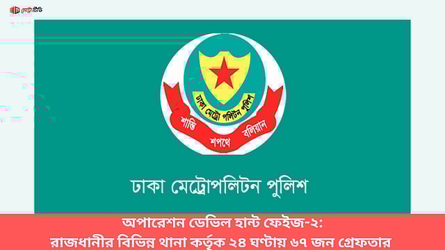 রাজধানীতে অপারেশন ডেভিল হান্ট ফেইজ-২ এর আওতায় গত ২৪ ঘণ্টায় অভিযান পরিচালনা করে বিভিন্ন অপরাধে জড়িত মোট ৬৭ (সাতষট্টি) জনকে গ্রেফতার করেছে ঢাকা মেট্রোপলিটন পুলিশের যাত্রাবাড়ী, মুগদা, রূপনগর,হাতিরঝিল থানা, শেরেবাংলা নগর ও মিরপুর মডেল থানা পুলিশ। এর মধ্যে যাত্রাবাড়ী থানা ১৭ জন,মুগদা থানা ২৮ জন, রূপনগর থানা ৮ জন , রূপনগর,শেরেবাংলা নগর থানা ৩ জন,হাতিরঝিল থানা ৮ জন ও মিরপুর মডেল থানা ৩ জনকে গ্রেফতার করেছে।