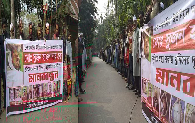 ওই নৃশংস হত্যাকান্ডের প্রতিবাদে সকল স্তরের মানুষ মানববন্ধন কর্মসূচিতে যোগ দেন। প্রতিবাদকারীরা ওই সমাবেশ থেকে হত্যাকারীদের ছবিসহ ব্যানার নিয়ে বিক্ষোভ করেন এবং হত্যাকারীদের অবিলম্বে গ্রেফতারের দাবী জানিয়ে দ্রত পদক্ষেপ নিতে স্থানীয় প্রশাসনকে অনুরোধ জানান।