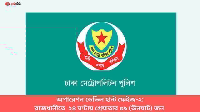 রাজধানীতে অপারেশন ডেভিল হান্ট ফেইজ-২ এর আওতায় গত ২৪ ঘণ্টায় অভিযান পরিচালনা করে বিভিন্ন অপরাধে জড়িত মোট ৫৯ (ঊনষাট) জনকে গ্রেফতার করেছে ঢাকা মেট্রোপলিটন পুলিশের যাত্রাবাড়ী, মুগদা, রূপনগর, মতিঝিল ও হাতিরঝিল থানা পুলিশ। এর মধ্যে যাত্রাবাড়ী থানা ১৩ জন, মুগদা থানা ১৫ জন, রূপনগর থানা ১২ জন, মতিঝিল থানা পাঁচজন ও হাতিরঝিল থানা ১৪ জন।