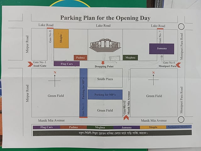 উল্লেখ্য, পদ্মা, মেঘনা, যমুনা এবং শাপলা স্টিকারযুক্ত গাড়ির পার্কিং সংসদ ভবনের অভ্যন্তরে বিভিন্ন স্থানে হবে এবং বকুল, শিমুল ও শিউলি স্টিকারযুক্ত গাড়ির পার্কিং পুরাতন বাণিজ্য মেলা বাণিজ্য মেলা মাঠে থাকবে।
