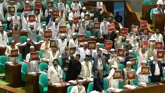 এ সময় বিরোধী দলের সংসদ সদস্যরা দাঁড়িয়ে প্রতিবাদ জানান। তাদের হাতে প্ল্যাকার্ড দেখা যায়। প্ল্যাকার্ডে জুলাই নিয়ে গাদ্দারি চলবে না, জুলাইয়ের সঙ্গে বিশ্বাসযোগ্যতা বন্ধ করসহ বিভিন্ন স্লোগান লেখা রয়েছে। স্পিকার এ সময় সবাইকে শান্ত থাকতে আহ্বান জানান।