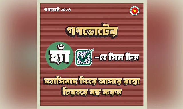 আজ প্রকাশিত ফটোকার্ডটি সামাজিক যোগাযোগমাধ্যমে শেয়ার করা হয়। এতে লেখা রয়েছে— ‘গণভোটের ‘হ্যাঁ’-তে সিল দিন, ফ্যাসিবাদ ফিরে আসার রাস্তা চিরতরে বন্ধ করুন।’