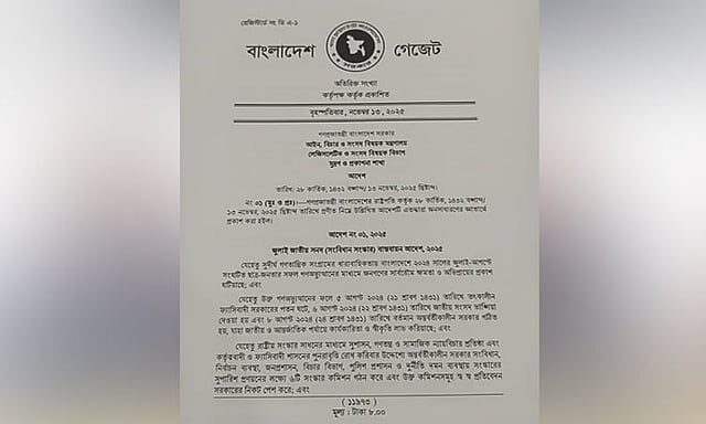 আজ বৃহস্পতিবার আইন, বিচার ও সংসদ বিষয়ক মন্ত্রণালয়ের লেজিসলেটিভ ও সংসদ বিষয়ক বিভাগ মুদ্রণ ও প্রকাশনা বিভাগ থেকে আদেশটি জনসাধারণের জ্ঞাতার্থে প্রকাশ করা হয়েছে।